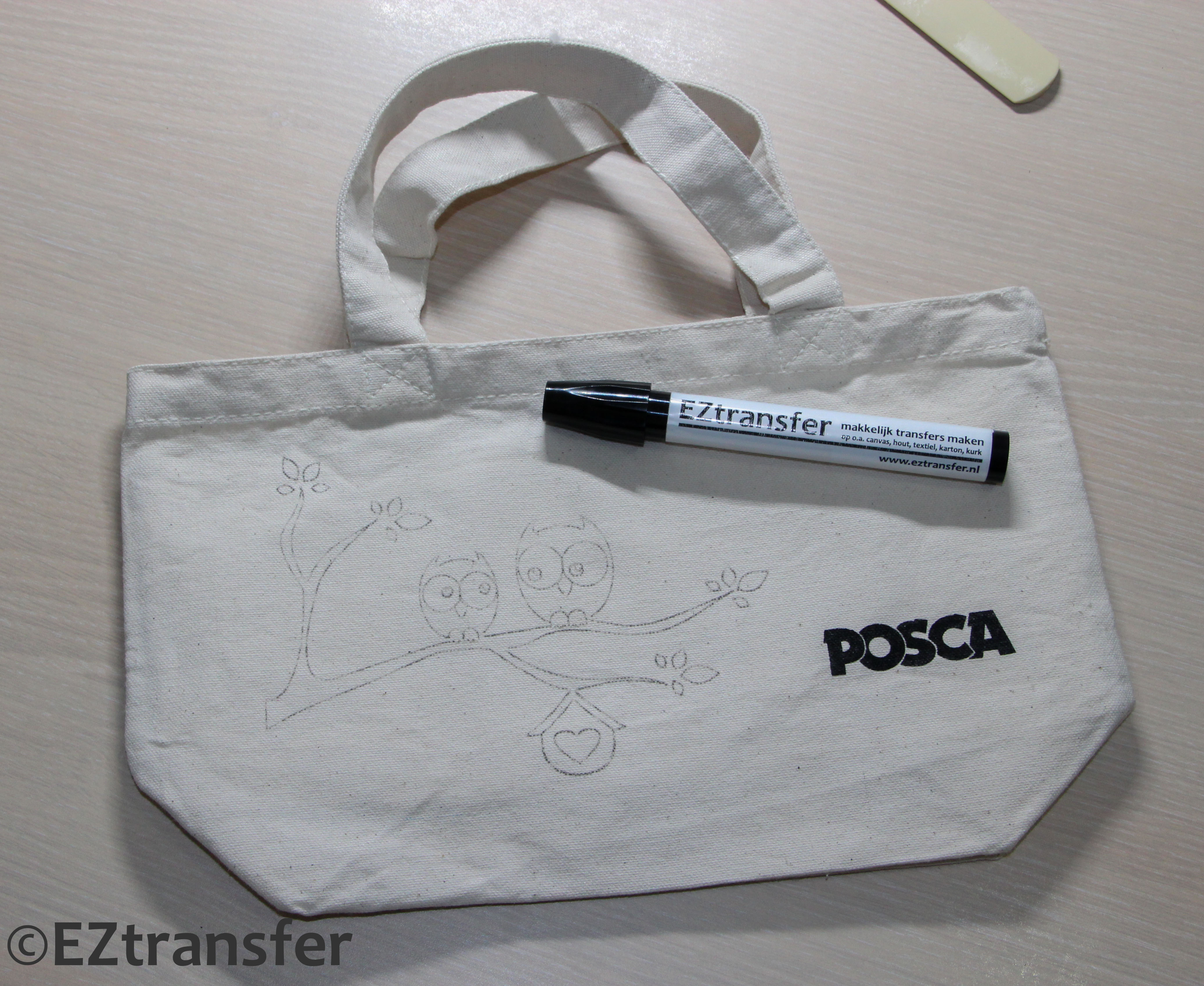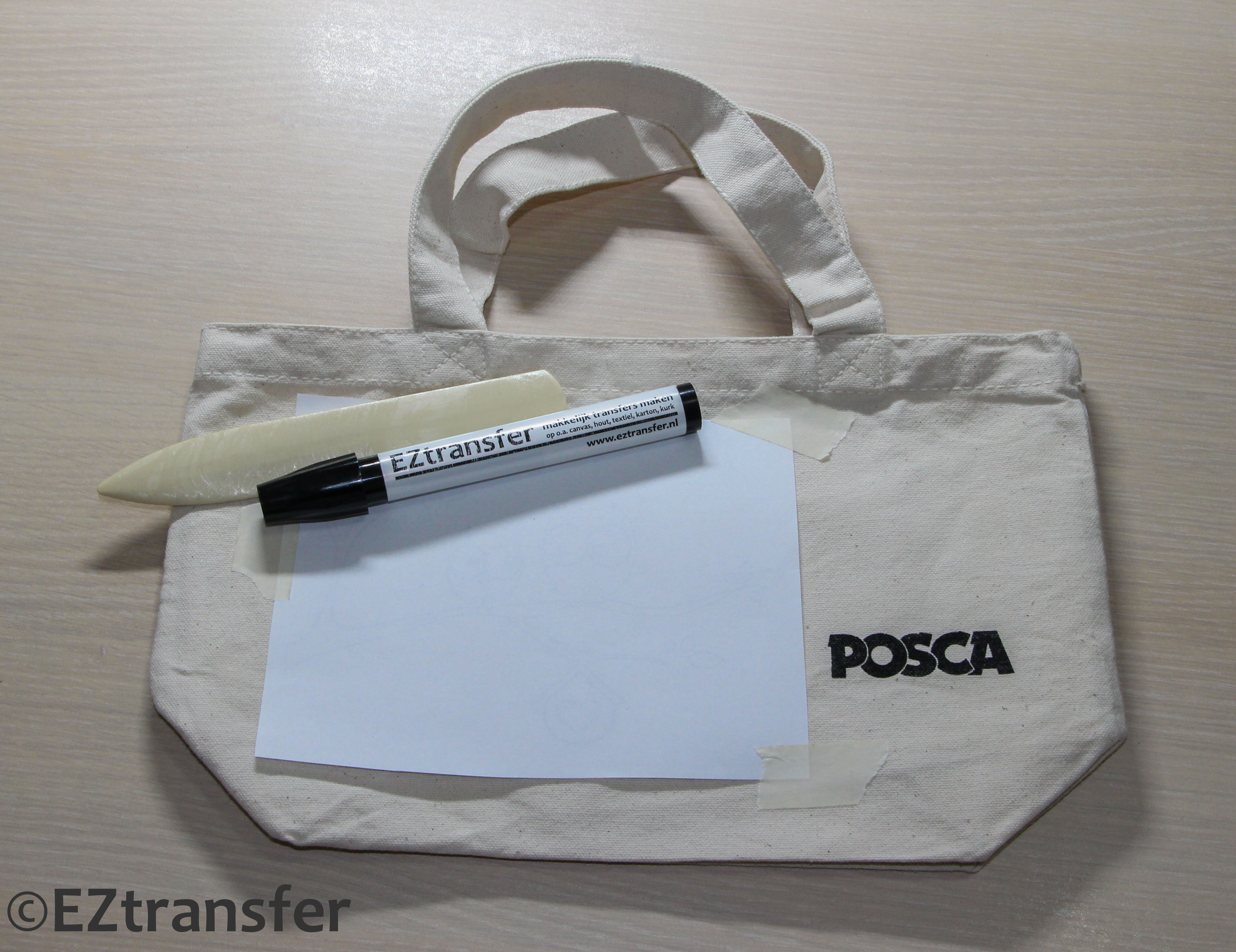 Het maken van deze houten schijfjes is heel eenvoudig met de EZtransfer. Je print de gewenste illustraties uit met een laserprinter en knipt ze ruim uit (ongeveer de grootte van het schijfje). Dan plak je de afbeelding met de print naar beneden op het schijfje met een stukje schilderstape. Let wel op dat je de tape niet over de afbeelding plakt.